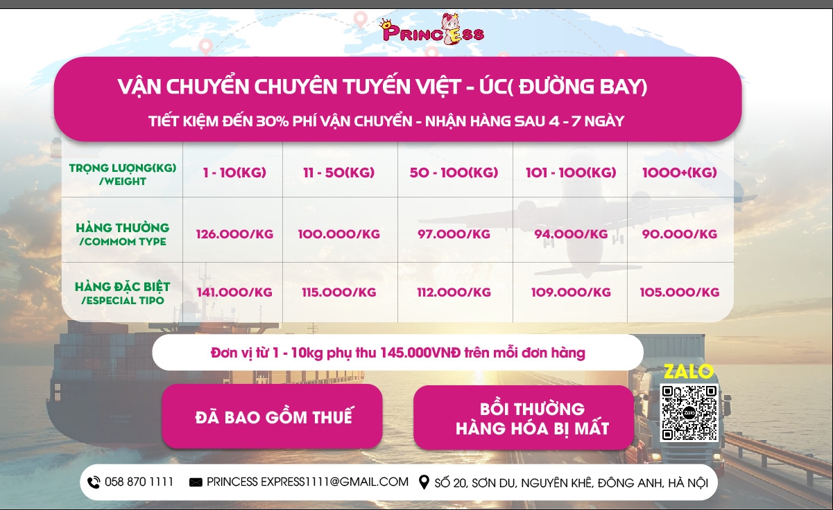 Nhu cầu vận chuyển hàng hoá quốc tế của các cá nhân, doanh nghiệp ngày càng tăng, Princess Express ra đời với mục tiêu là người đồng hành cùng những chuyến hàng của quý khách. Dịch vụ vận chuyển hàng Việt Nam- Úc của Princess Express đảm bảo thời gian nhanh chóng, an toàn với giá cước tối ưu. Trao niềm tin cho Princess Express chúng tôi sẽ giúp bạn nhận lại những lợi ích và giá trị xứng đáng.